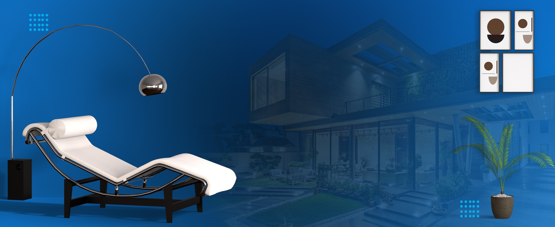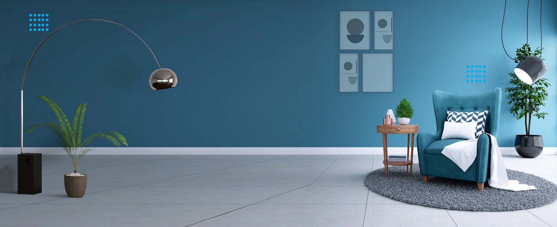 A bold ombre blue sculptural partition anchors the home, weaving its hue subtly through various spaces.